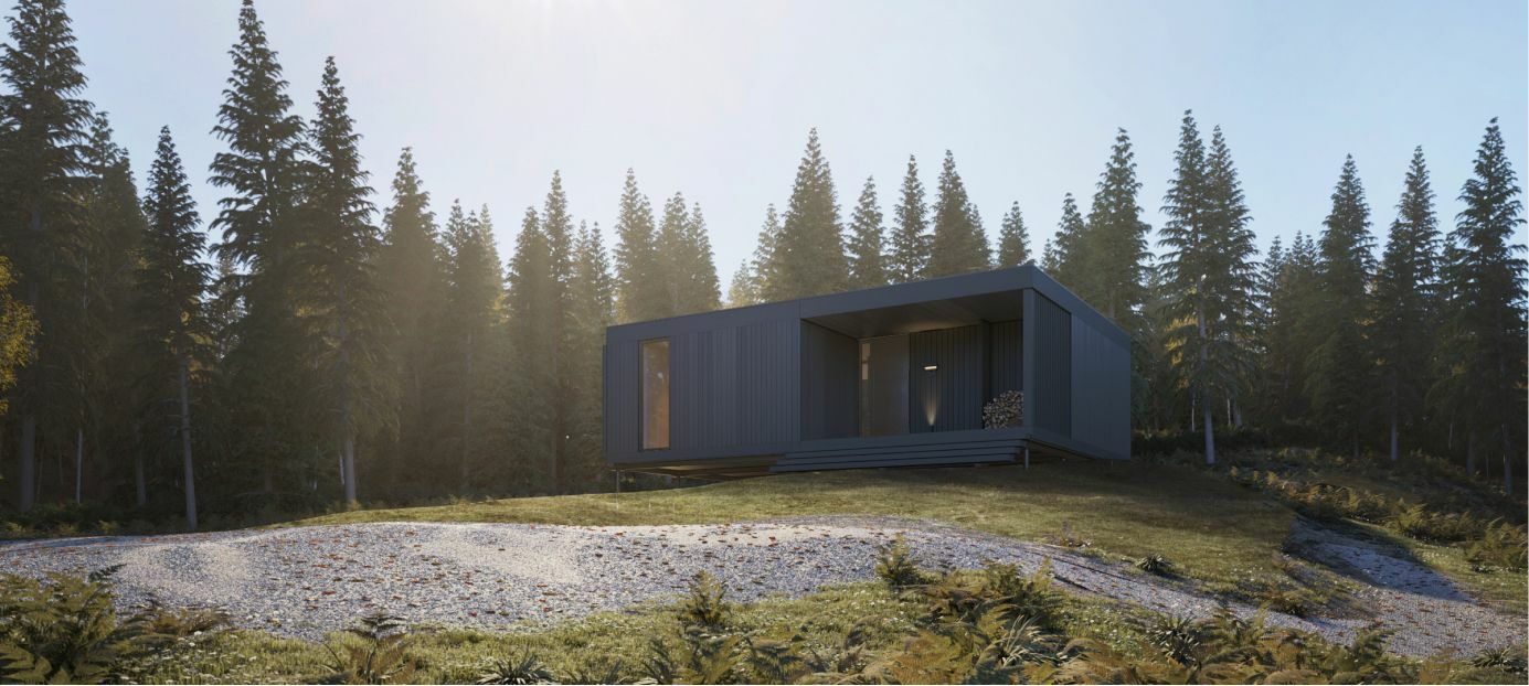 Типовой модульной дом для круглогодичного проживания c 2 спальнями, кухней-гостинной и просторной крытой террасой