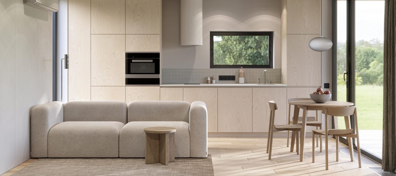 На небольшой квадратуре разместились все удобства. У дома есть два основных входа, что отвечает стандартным земельных участкам. Главный вход с террасой, где можно разместить, например, дрова, велосипед. Отдельная прихожая с хранением. Кухня-гостиная, где пространство использовано максимально эффективно: диван и место для просмотра телевизора, просторная кухня, обеденная зона возле панорамного остекления и видом на внутренний двор. Собственная крытая терраса с подсветкой, где можно разместить стол, стулья или лежаки. Отдельная спальня с рабочим местом и хранением.